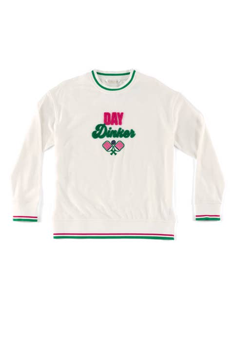 Get ready to embrace your pickleball passion in style with the "Day Dinker" Sweatshirt! Featuring a playful embroidered logo with crossed paddles and a ball, this sweatshirt perfectly captures the sporty vibes you love. Crafted from a premium cotton and polyester blend, it's soft, cozy, and ideal for lounging or cheering courtside. The striped ribbed cuffs and hem add a fun, preppy twist to complete the look. Pair with other items from the Pickleball Collection to complete your look!