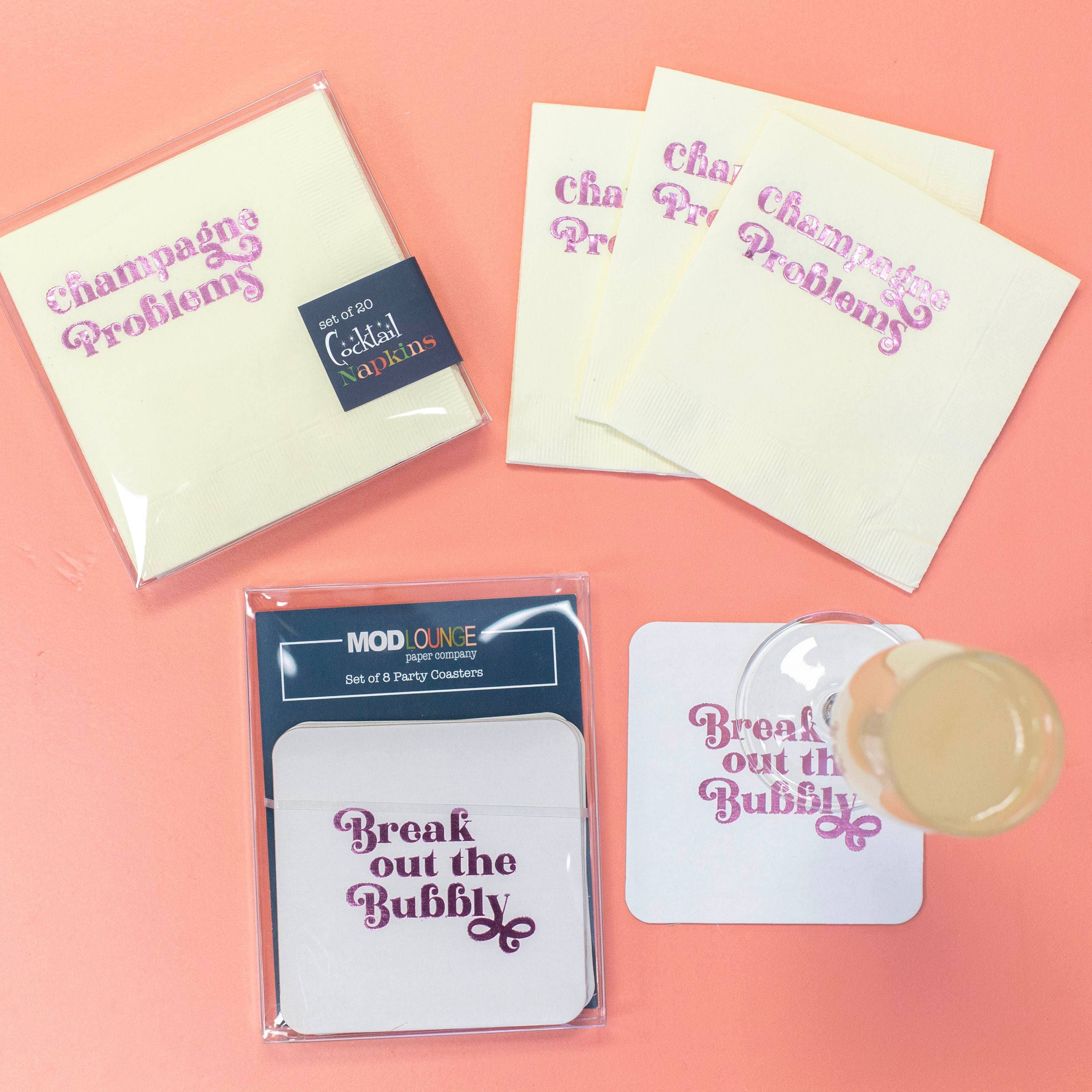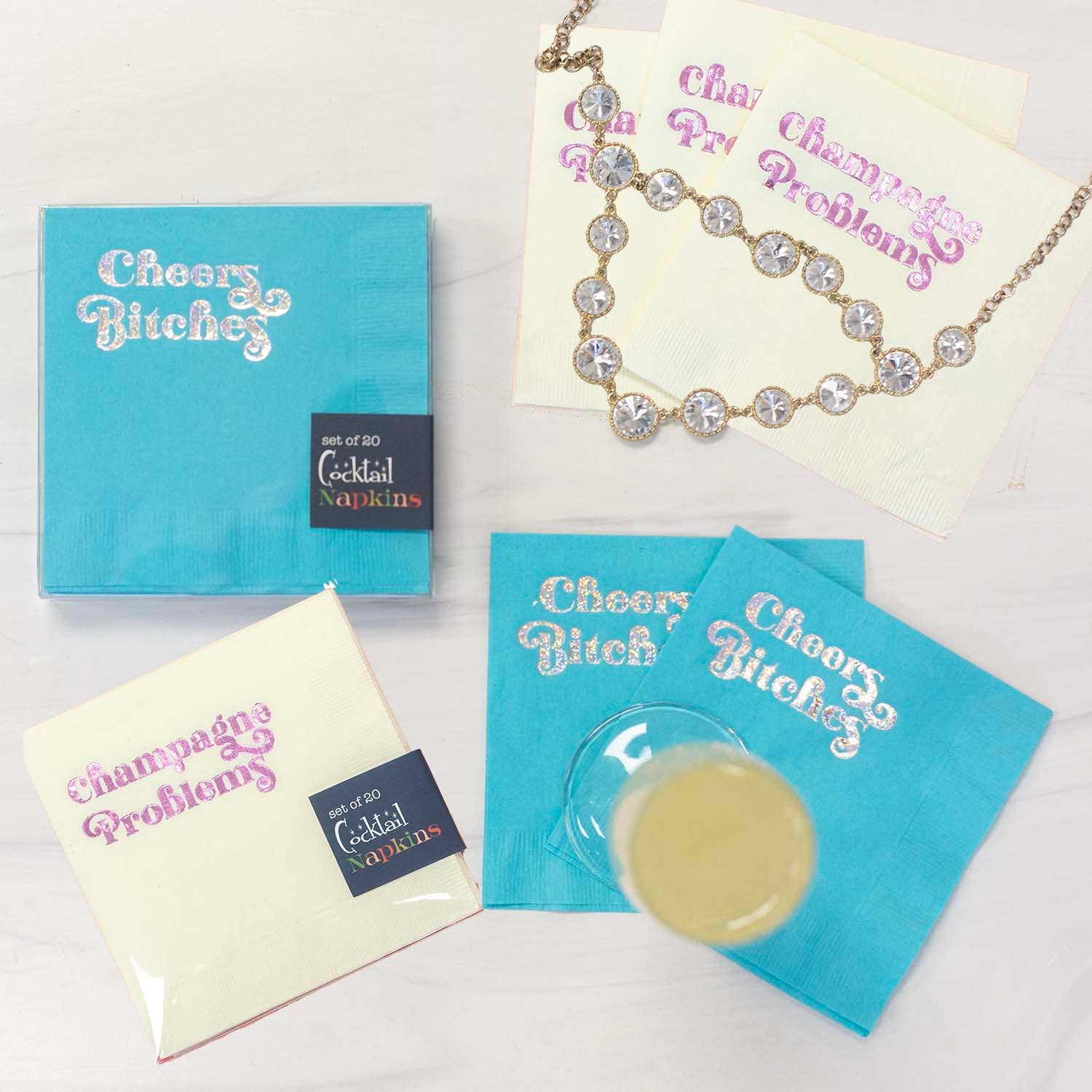 Also shown: Cheers Bitches Cocktail Napkin (BN-048) and Break out the Bubbly Foil Coasters (CO-010)