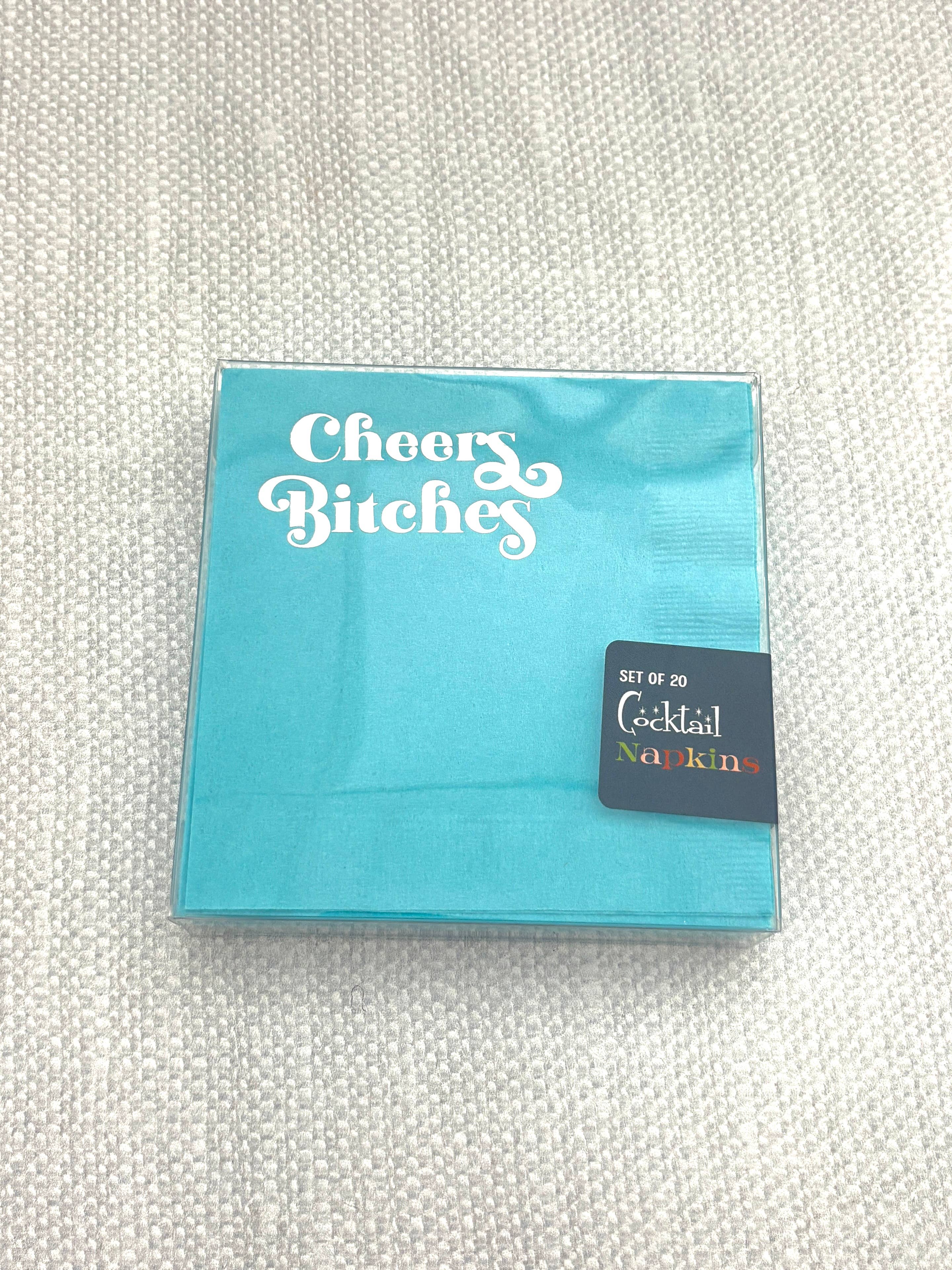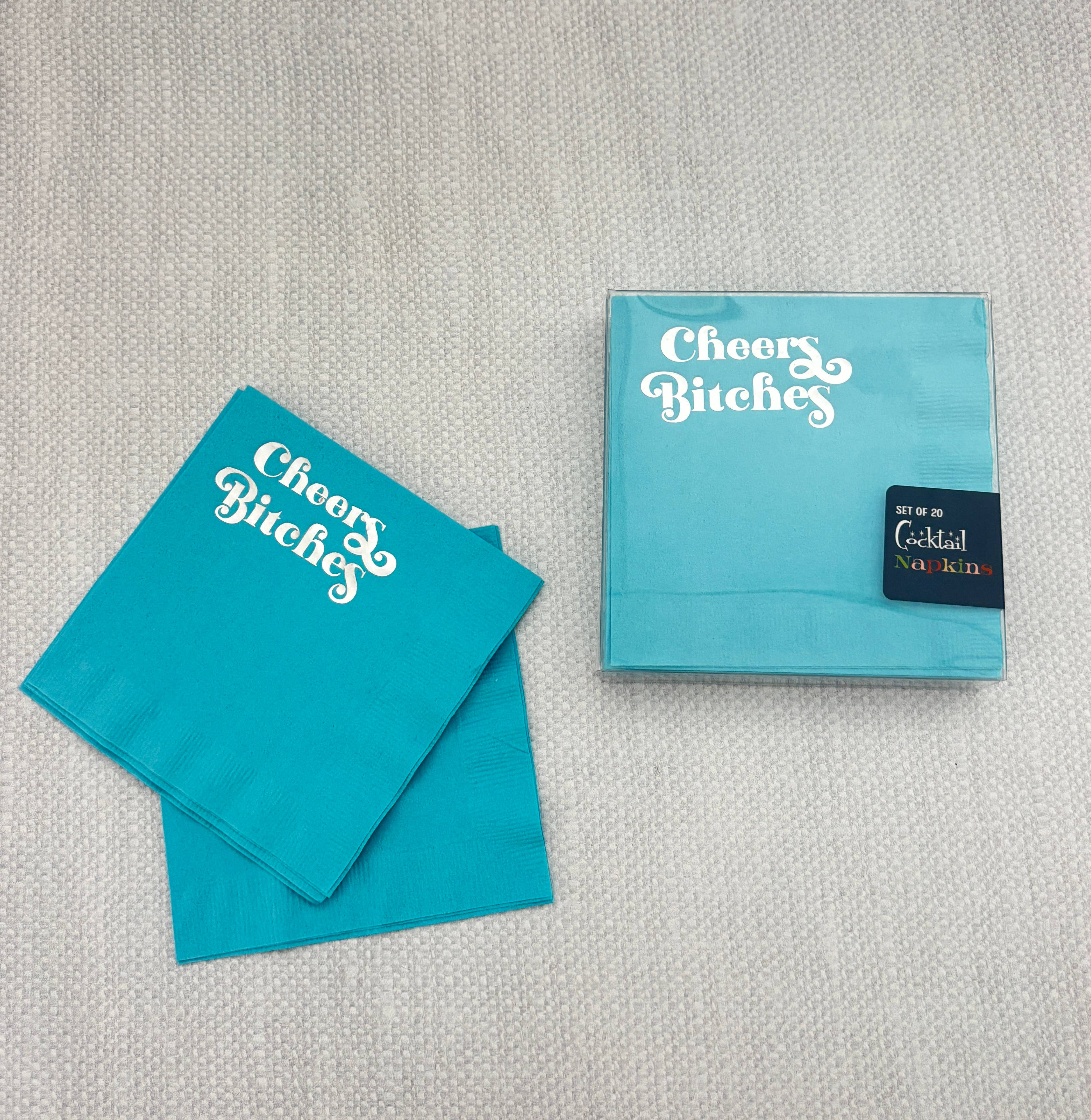Get ready to party in style with these trendy marine blue cocktail napkins! Featuring retro text that reads "cheers Bitches" in silver foil, these napkins are perfect for birthdays, bachelorettes, and girls night out. So gather your squad and get ready to cheers to a fun and unforgettable time!