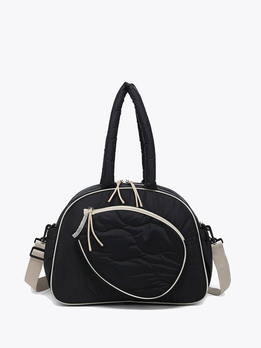 *Select colors on sale Item Detail: -Quilted Two-Tone Design: Stylish and durable for everyday use. -Dedicated Paddle Zip Pouch: Keeps your pickleball paddle secure and protected. -Multiple Storage Pockets: Includes two side pockets, a back zip pocket, four inner mesh pockets, and one inner zip pocket for easy organization. -Bottom Pad Base: Adds structure and stability to the bag. -Adjustable/Removable Strap: Provides versatile carrying options for comfort. Dimensions: -Length: 16.5 inches -Height: 12 inches -Depth: 4.25 inches -Shoulder Strap Drop: 10 inches -Adjustable Strap Drop: 10” - 23.5” The Banks Pickleball Duffle Bag is the perfect blend of fashion and function, offering ample space and convenience for players on the go. Its stylish design and practical compartments make it an ideal choice for carrying your gear while staying chic this spring and summer.