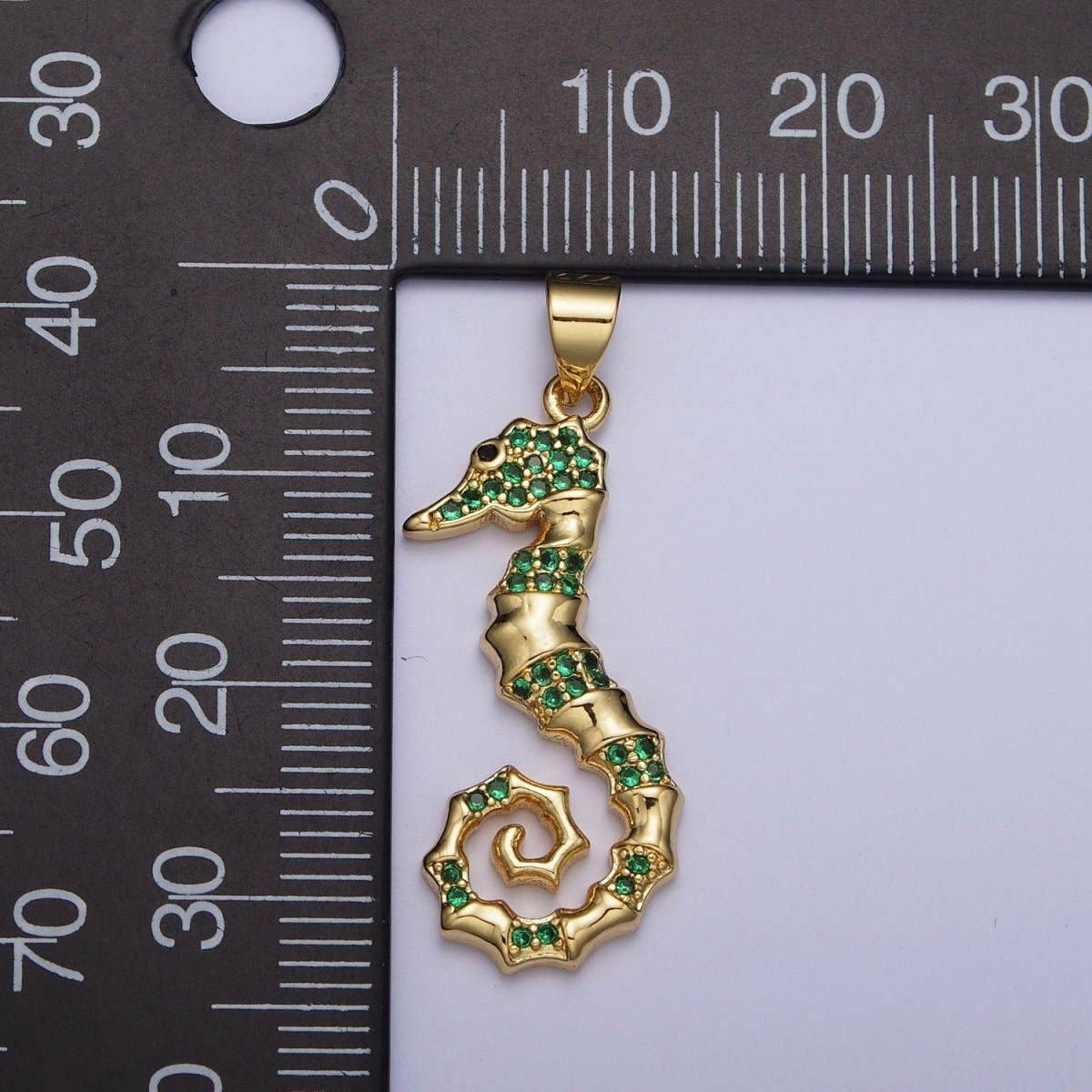 Emerald Green Micro Pave Cubic Zirconia Seahorse Ocean Wildlife Gold Charm For Jewelry Making | X-475