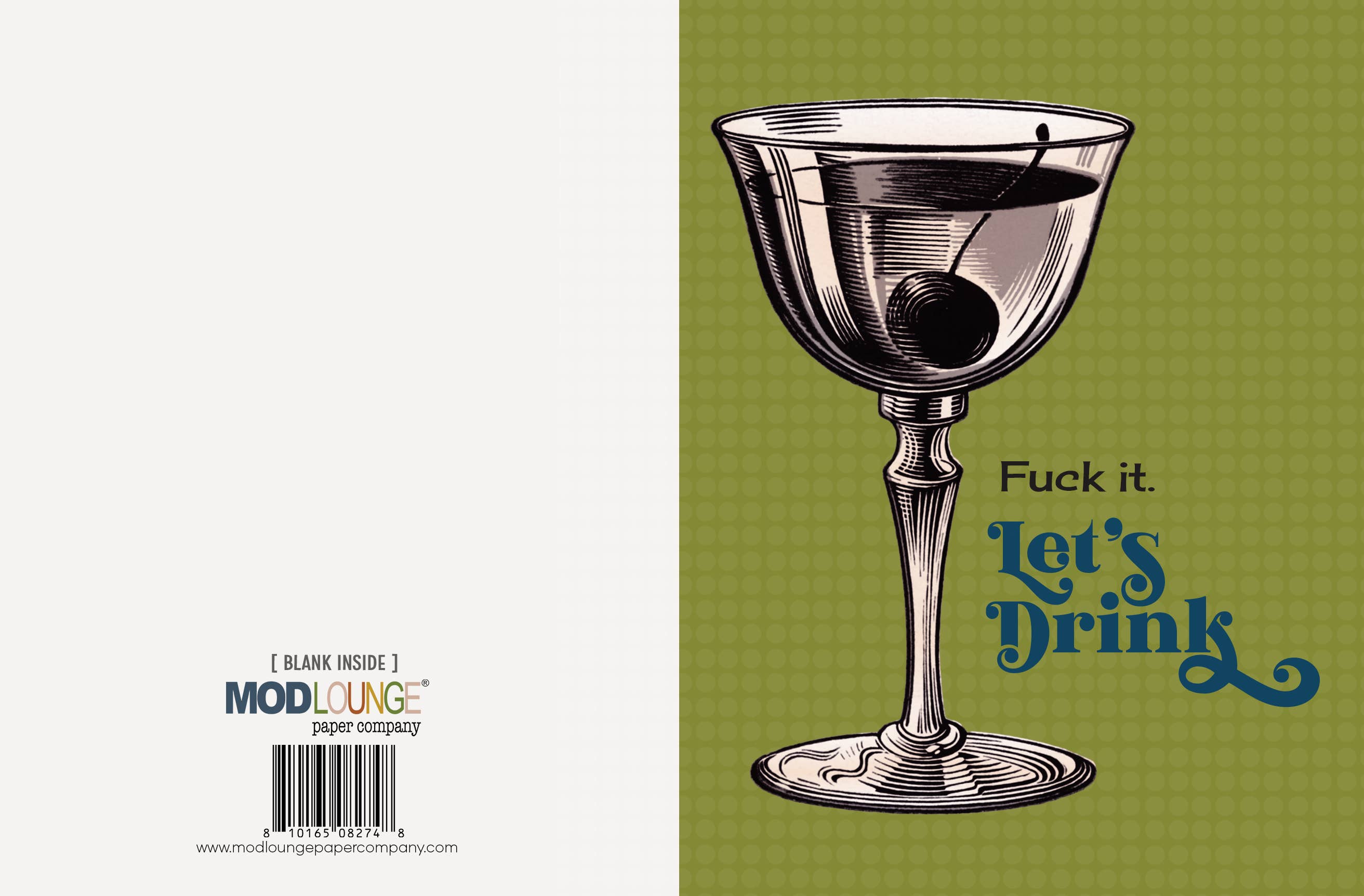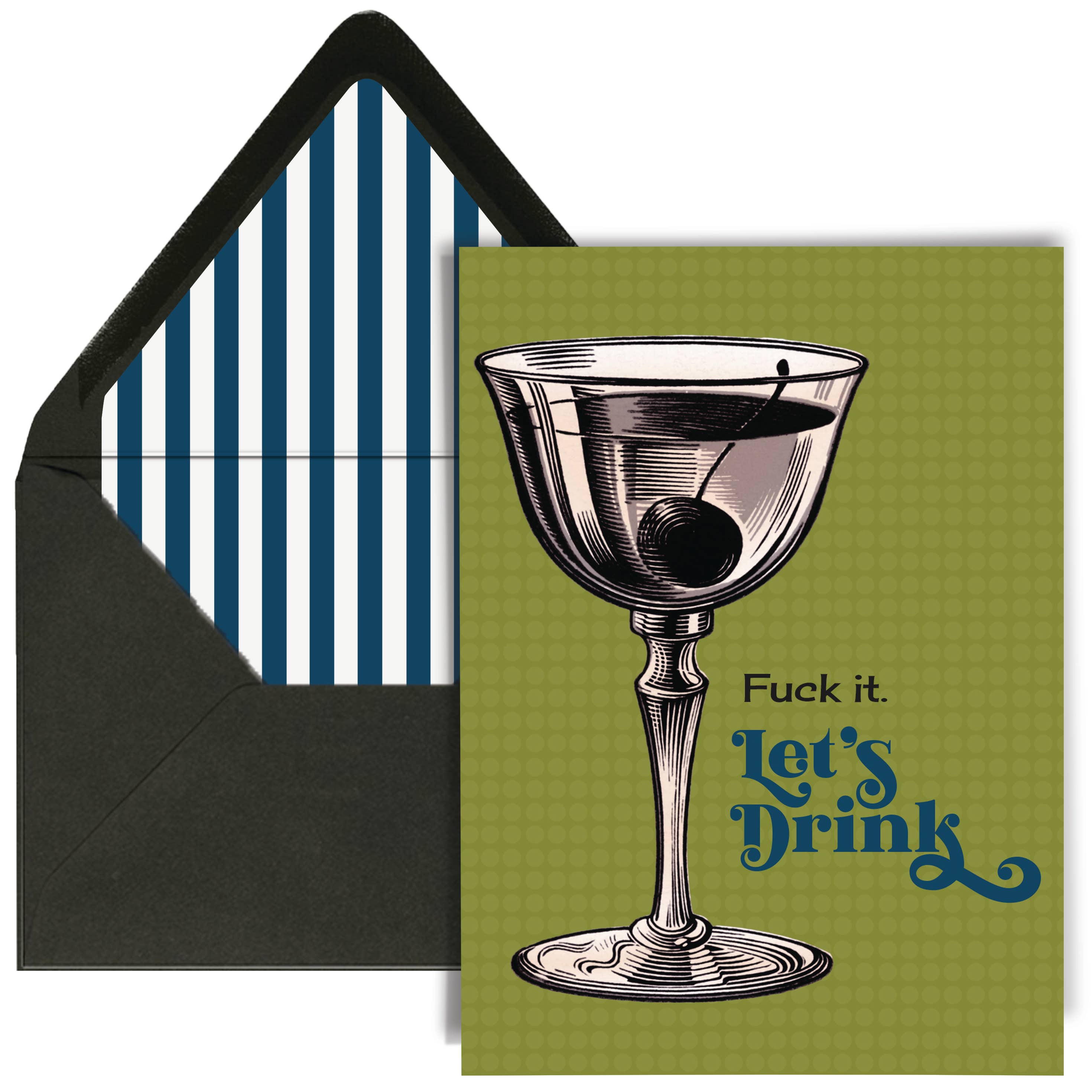 Cheers to a good time with this vintage cocktail greeting card! Featuring a classic cocktail illustration and a retro font in a vintage green and teal color palette. The funny text reads "fuck it. lets drink", making it a perfect card for any occasion. Embrace the fun and enjoy a drink or two with this charming card!