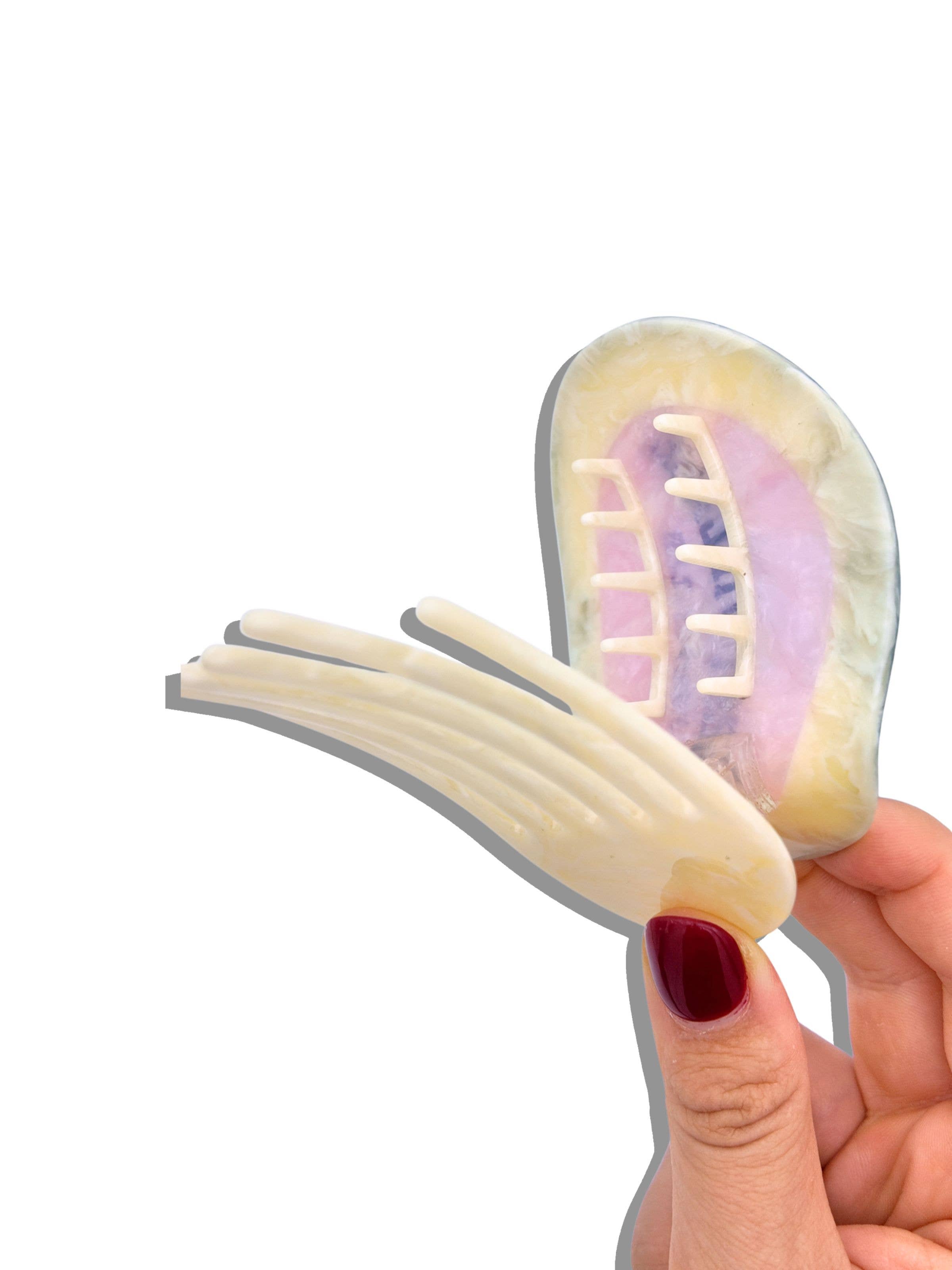 Handmade by our Solar Eclipse artists in small batches, this flat claw clip is crafted from biodegradable acetate and designed for real life: perfect for laying down, working out (hello, pilates), driving, flying, or sleeping.