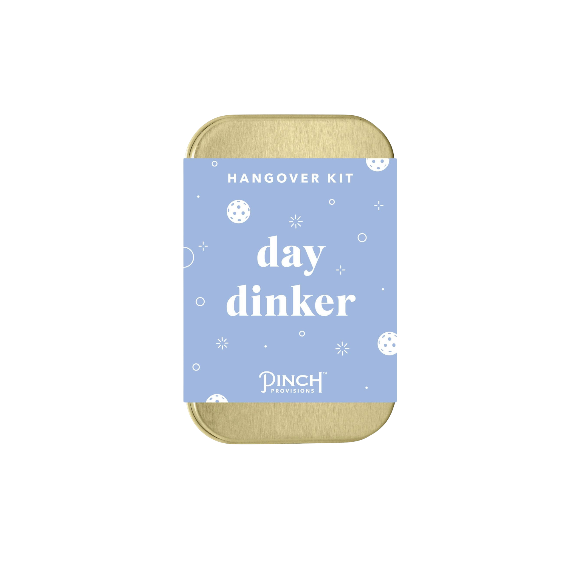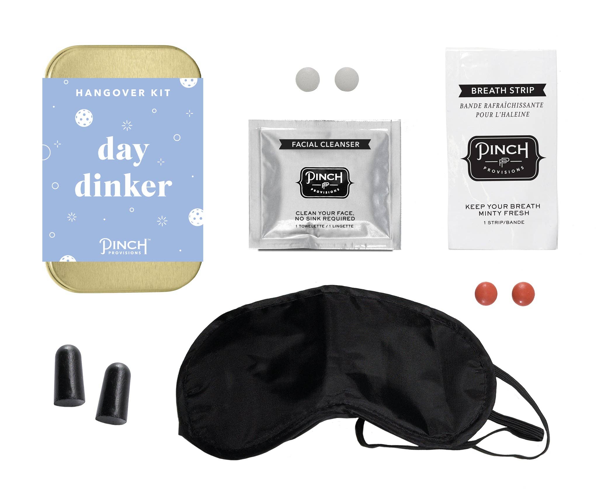 Whether you overdo it on the pickleball court or off, our "Day Dinker" Hangover Kits are the perfect partner. Now in a new mini tin size, each kit contains an eye mask, ear plugs, a facial cleansing towelette, pain reliever, electrolytes, and a breath strip.