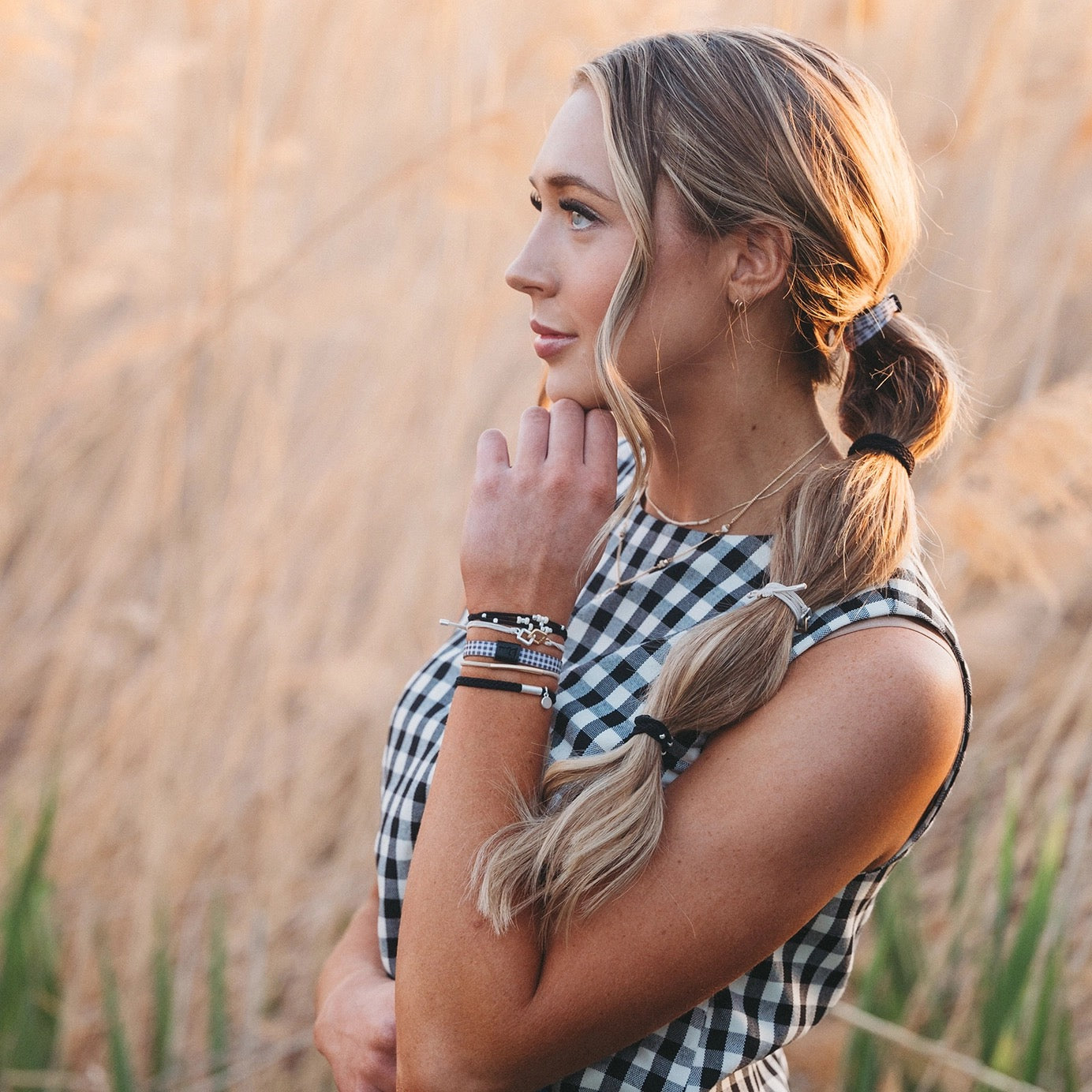 Our Unity set symbolizes connection and strength in togetherness. These 5 hair tie bracelets feature a timeless mix of black and tan tones, accented with silver and cream stone beads. A standout black and cream plaid band adds classic charm, while the gold and silver interlocking square charms represent harmony in diversity. This set is a beautiful reminder that we’re stronger when we stand united. Medium is the size of a normal hair tie band. It fits wrists between 5-6.4" around. Large is sized for wrists 6.5-7.5"