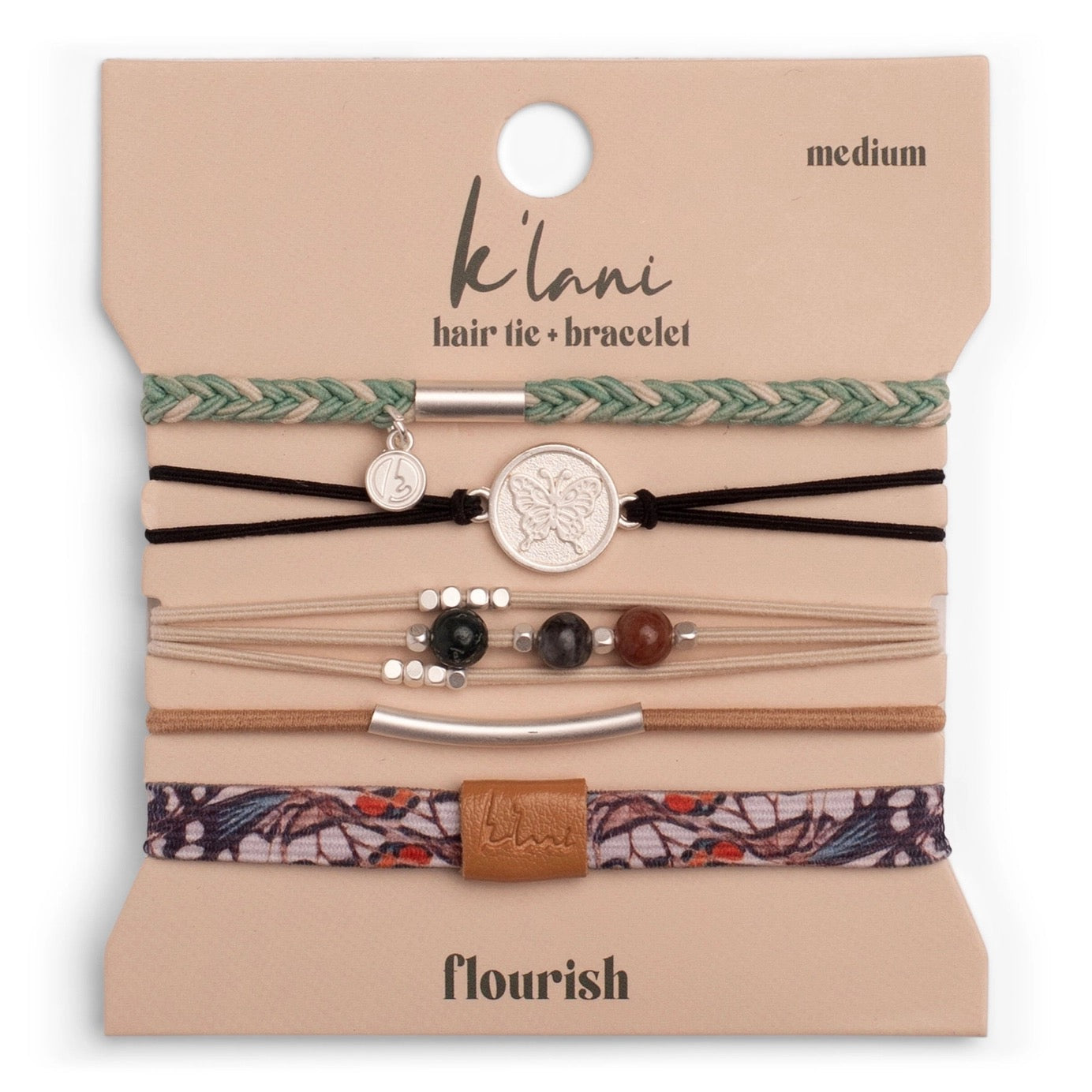 Our Flourish set is a tribute to growth, transformation, and natural beauty. These 5 hair tie bracelets feature a graceful blend of teal, black, and tan tones, accented with natural stone beads and a vibrant butterfly wing pattern. The delicate butterfly charm symbolizes change and confidence, reminding you to embrace your journey and flourish in your own unique way. Medium is the size of a normal hair tie band. It fits wrists between 5-6.4" around. Large is sized for wrists 6.5-7.5"