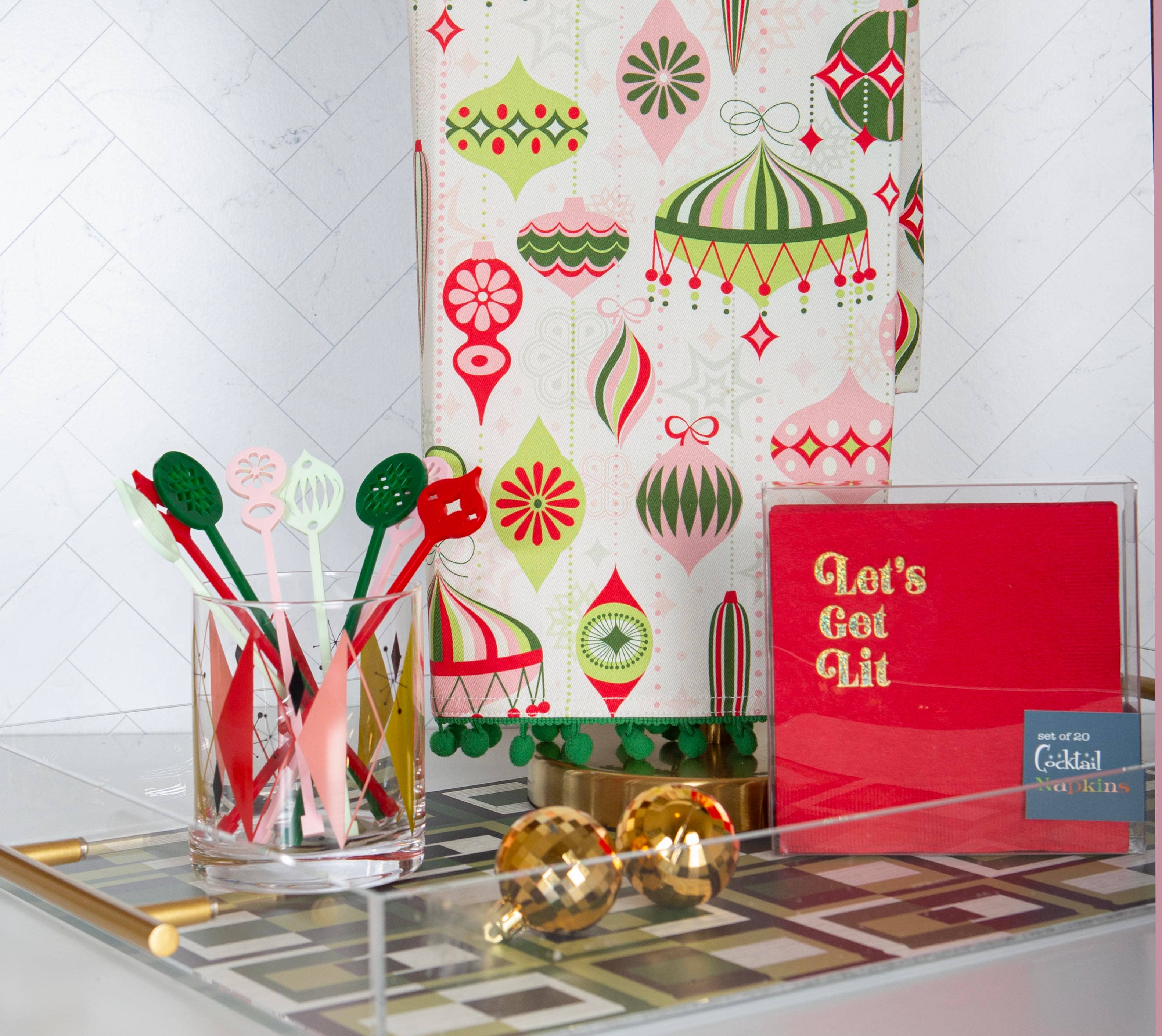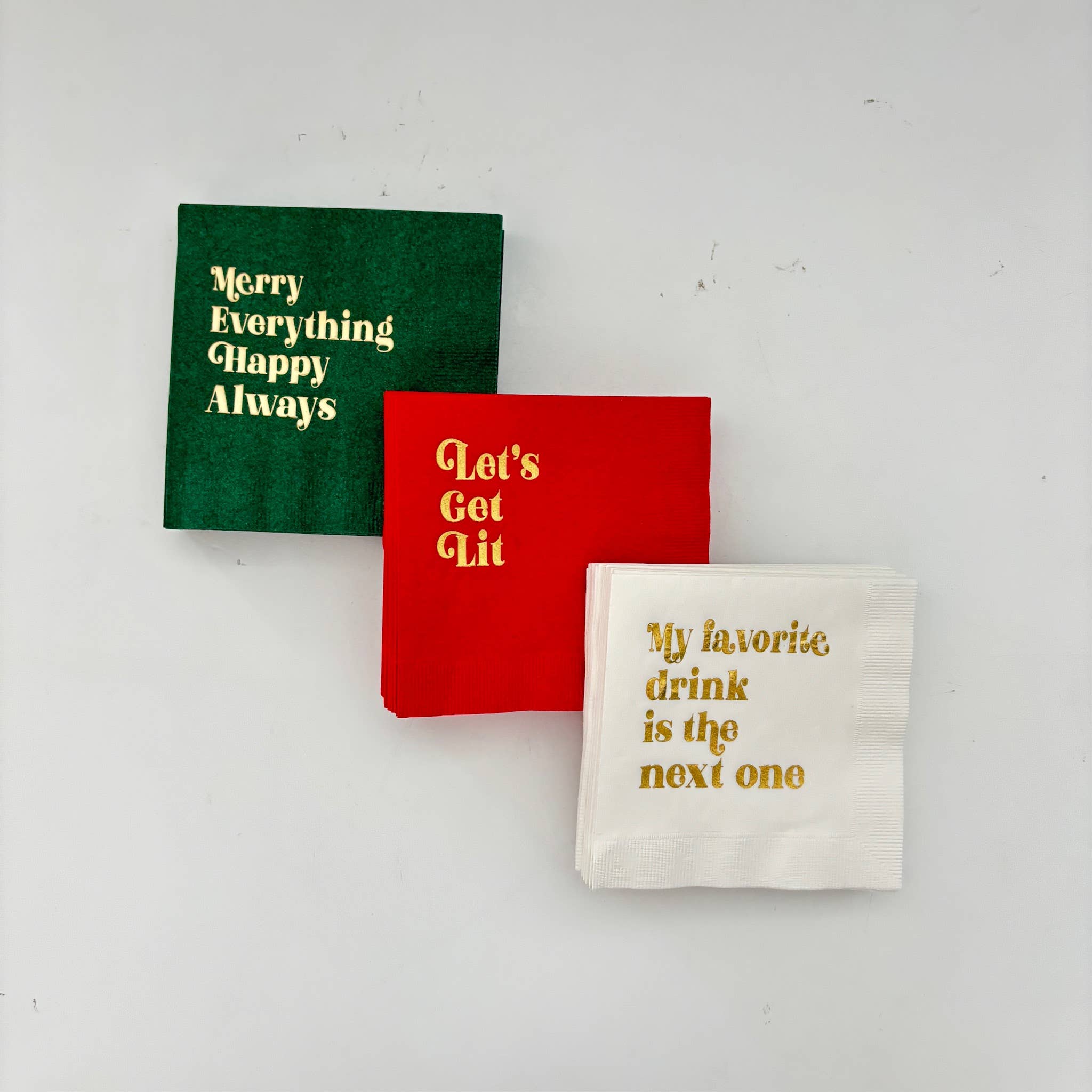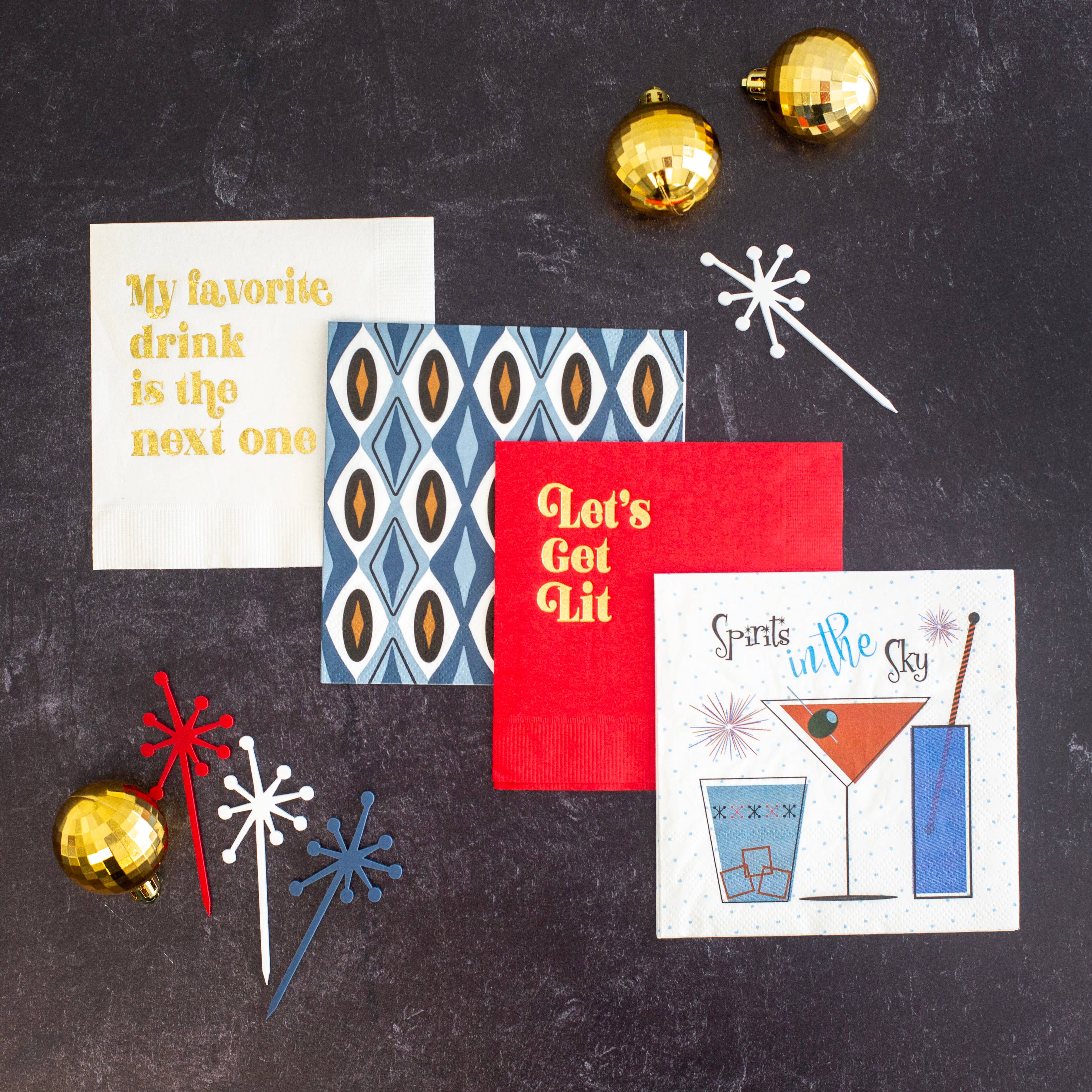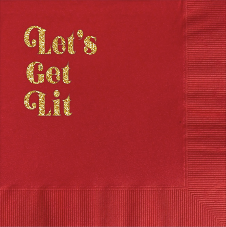 Light up the party with these chic Lets Get Lit cocktail napkins! Designed with intricate gold foil retro font text on a vibrant red background, these 3-ply napkins add an elegant touch to any occasion. Whether you’re celebrating with drinks, having a casual get-together, or gifting a host/hostess gift, enjoy responsibly and let the laughter last all night!