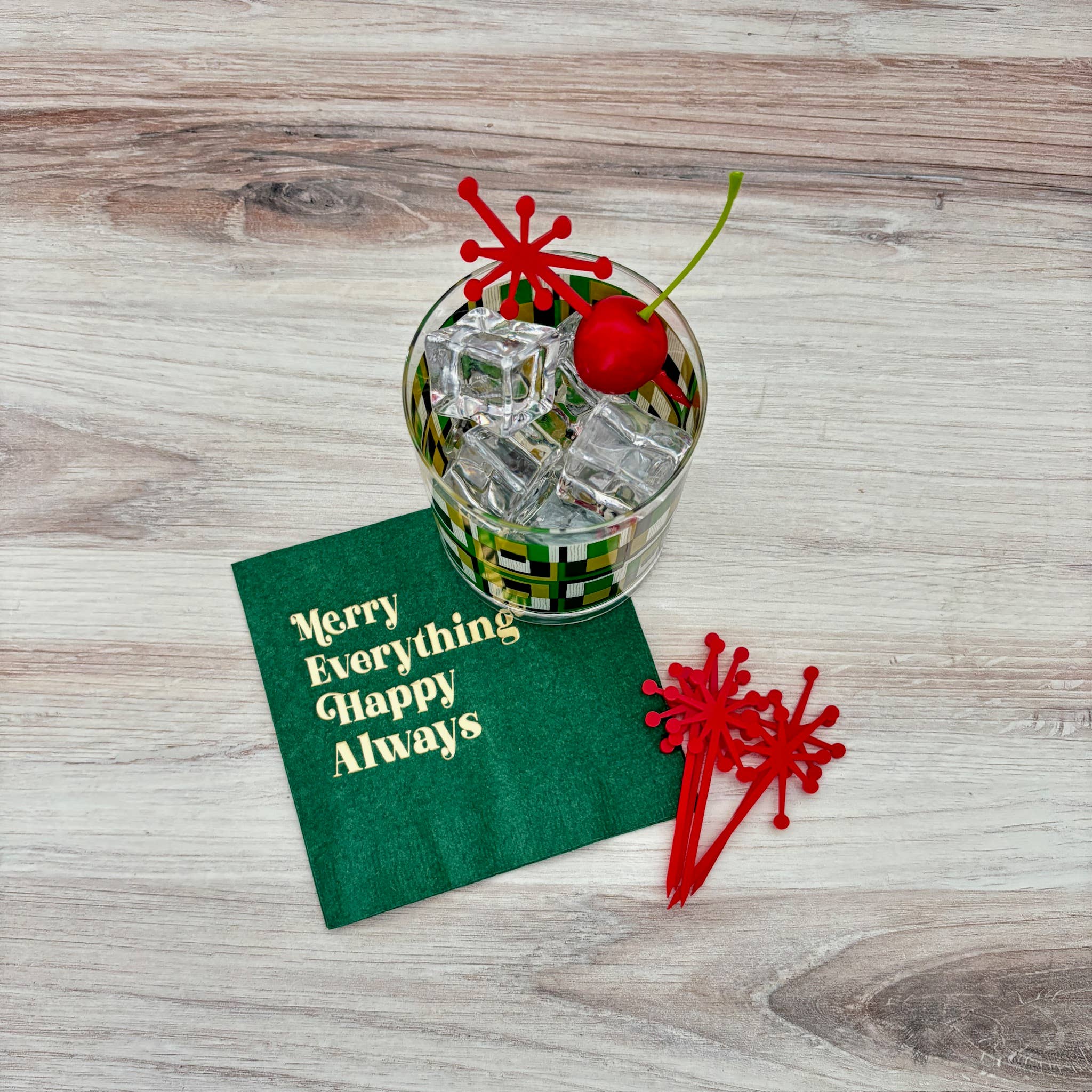 Light up the party with these chic Merry Everything Happy Always cocktail napkins! Designed with intricate gold foil retro font text on a vibrant green background, these 3-ply napkins add an endearing touch to any occasion. Celebrate with drinks, have a casual get-together, Holiday cocktail party or gift a host/hostess gif.