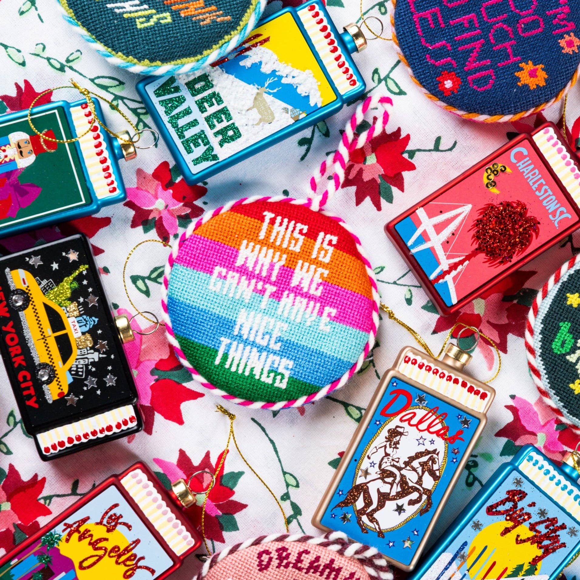 Let the fam know where things are at with this cheeky needlepoint ornament. Backed in luxe velvet, we've revived this Southern staple with sayings that are sure to get a smile. Take your holiday decor from trad to rad with Furbish's curated assortment of festive needlepoint pillows, ornaments, tree toppers, stockings, and tree skirts. Related Tags: seasonal, labor day sale, needlepoint ornaments, furbish holiday ornament, holiday collection, christmas decor, living room accent, holiday decoration, christmas tree decoration, xmas, xmas decor