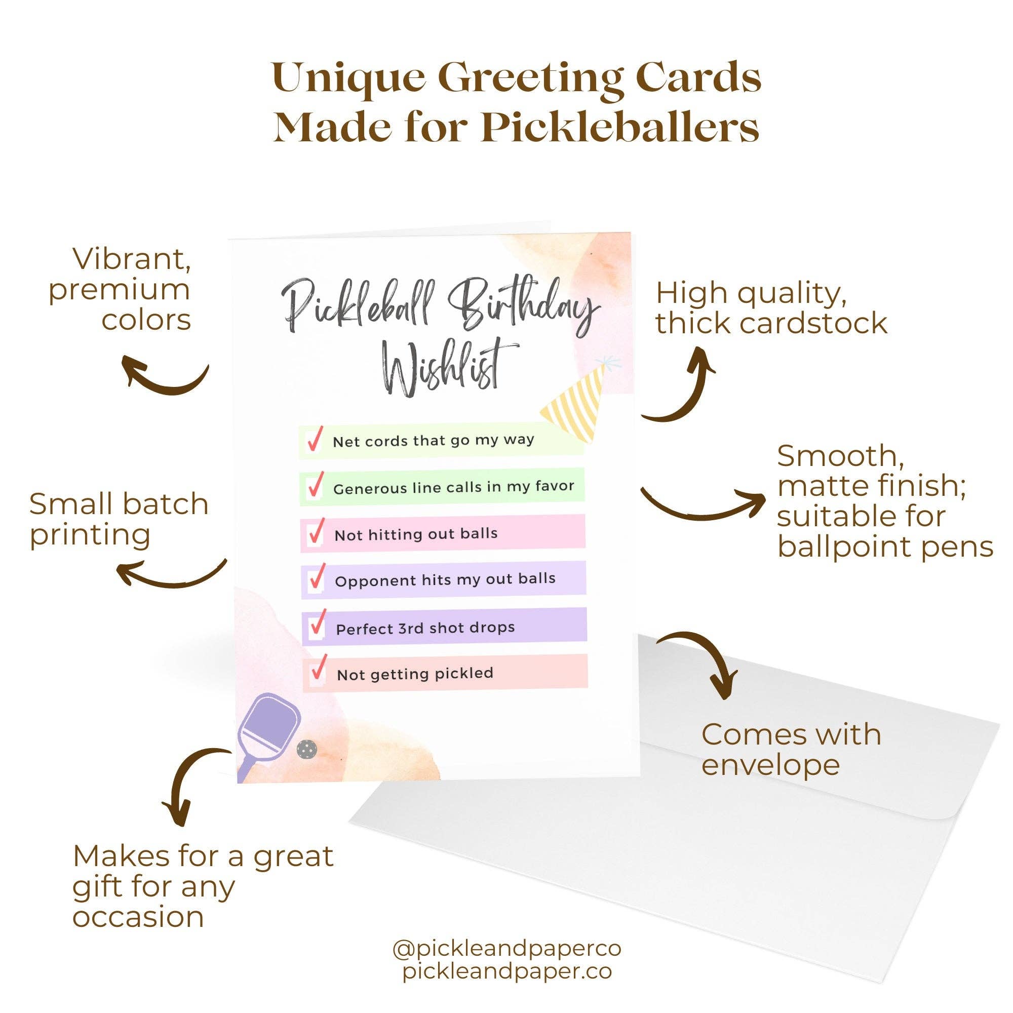 Our pickleball greeting cards are made on premium, high quality, thick gsm cardstock paper and printed with premium colors.