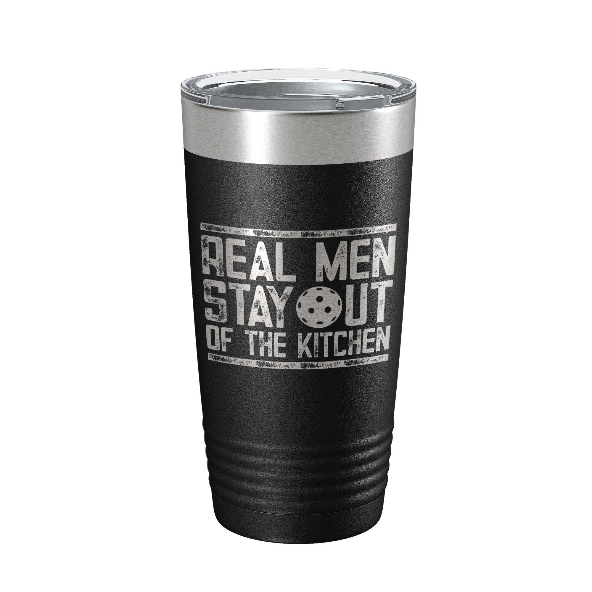 Pickleball real men stay out of the kitchen tumbler is made from 304 stainless steel and the design is permanently laser etched into the powder coat. The design will not peel or fade unlike vinyl decals and stickers. Clear lid is included and the hole on the lid is big enough for a straw. Double-wall vacuum insulation means the cup will not sweat and it keeps drinks hot or cold for hours. Mug has a narrower bottom to fit most standard cupholders. Ridges provide a secure grip. Cup measures 6.76" tall x 3.46" wide at top. Holds 20 fluid ounces or 591 mL. Hand wash only. 100% BPA free.