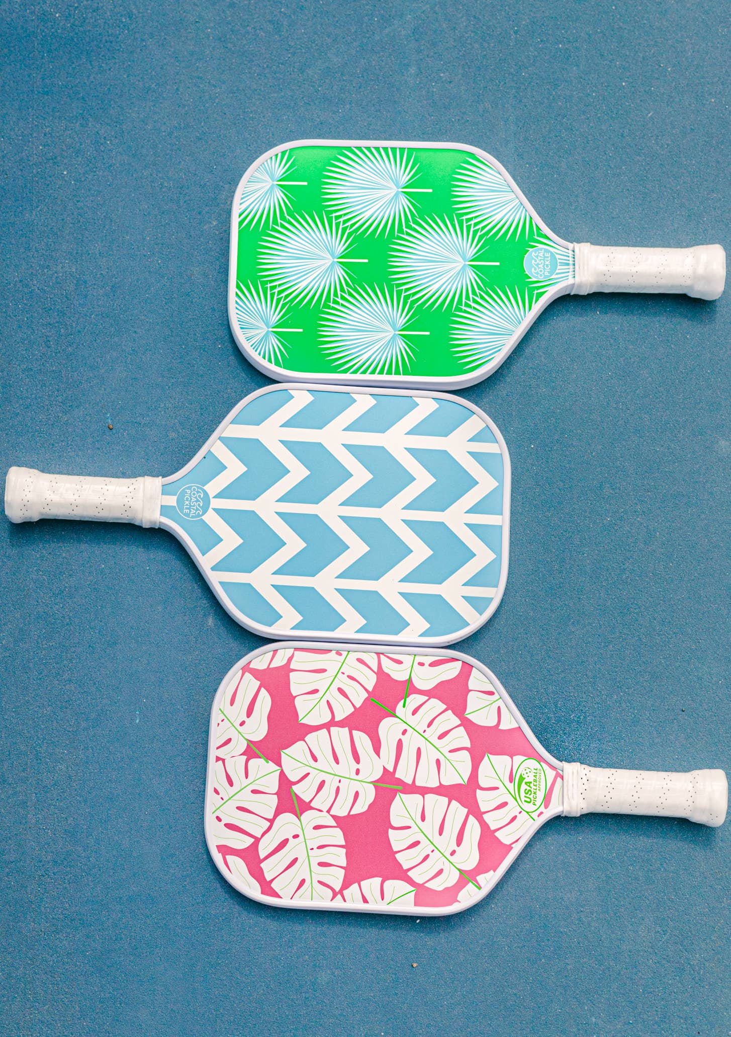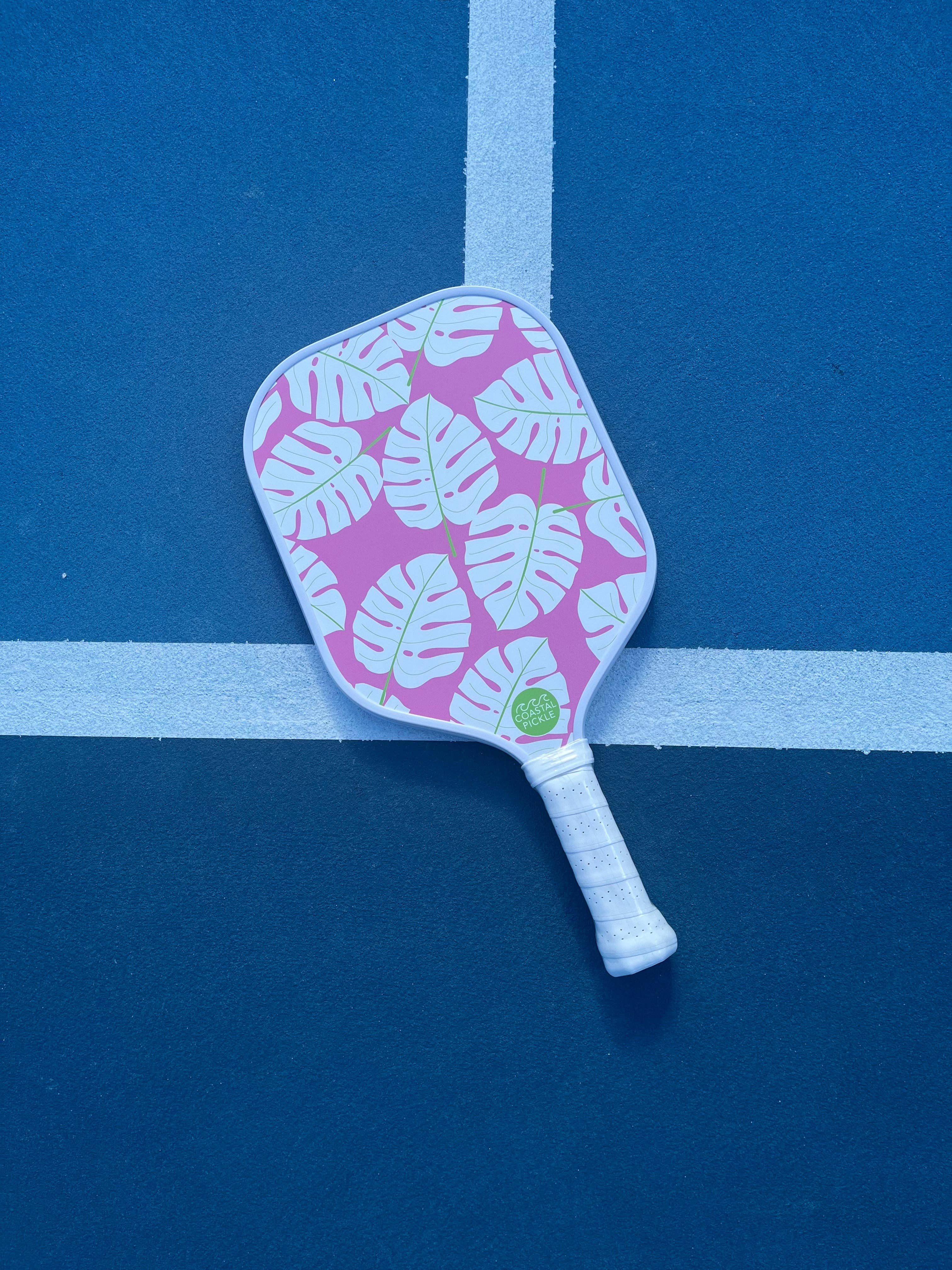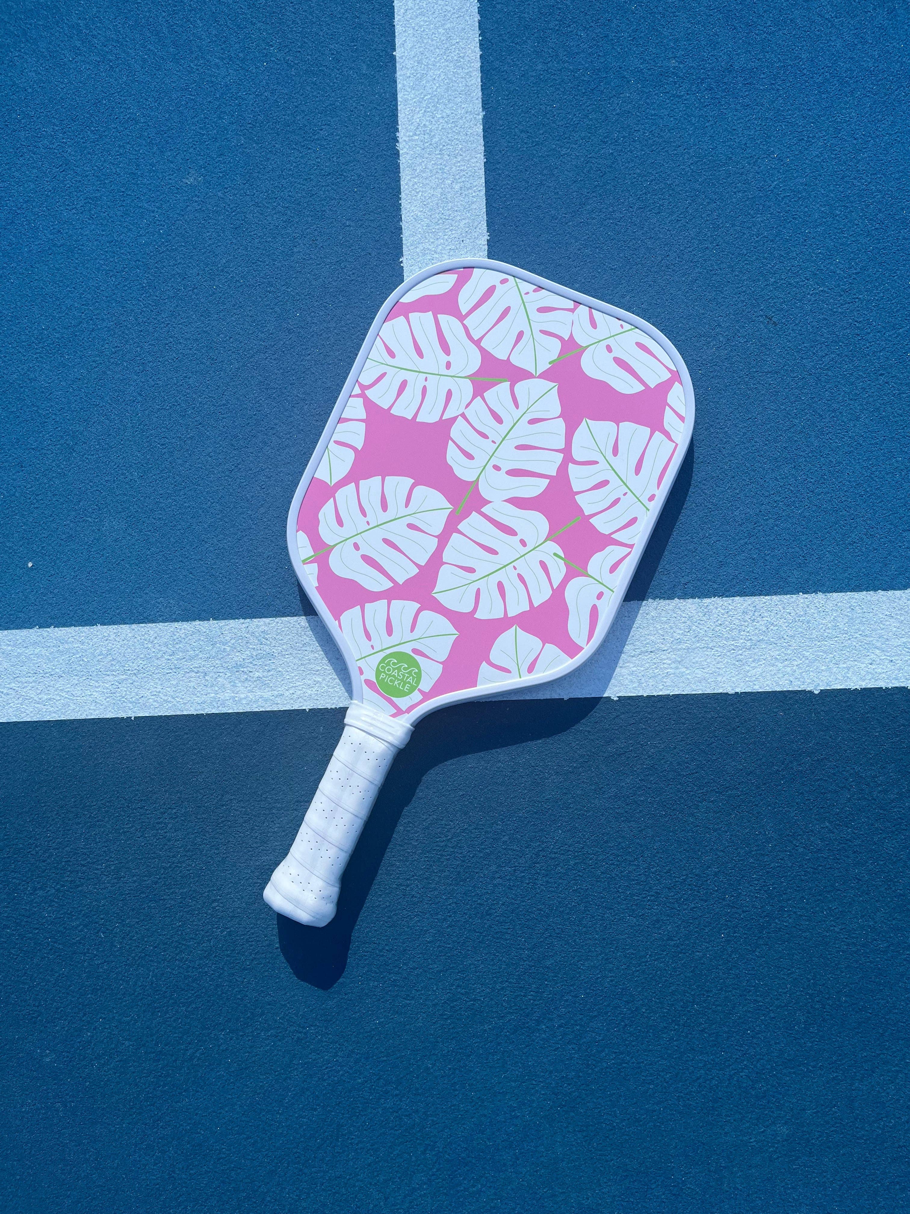 The design that started it all! This vibrant paddle features a brilliant pink background with pops of color from white palm leaves with subtle green accents. For those looking for a floral paddle this is it!