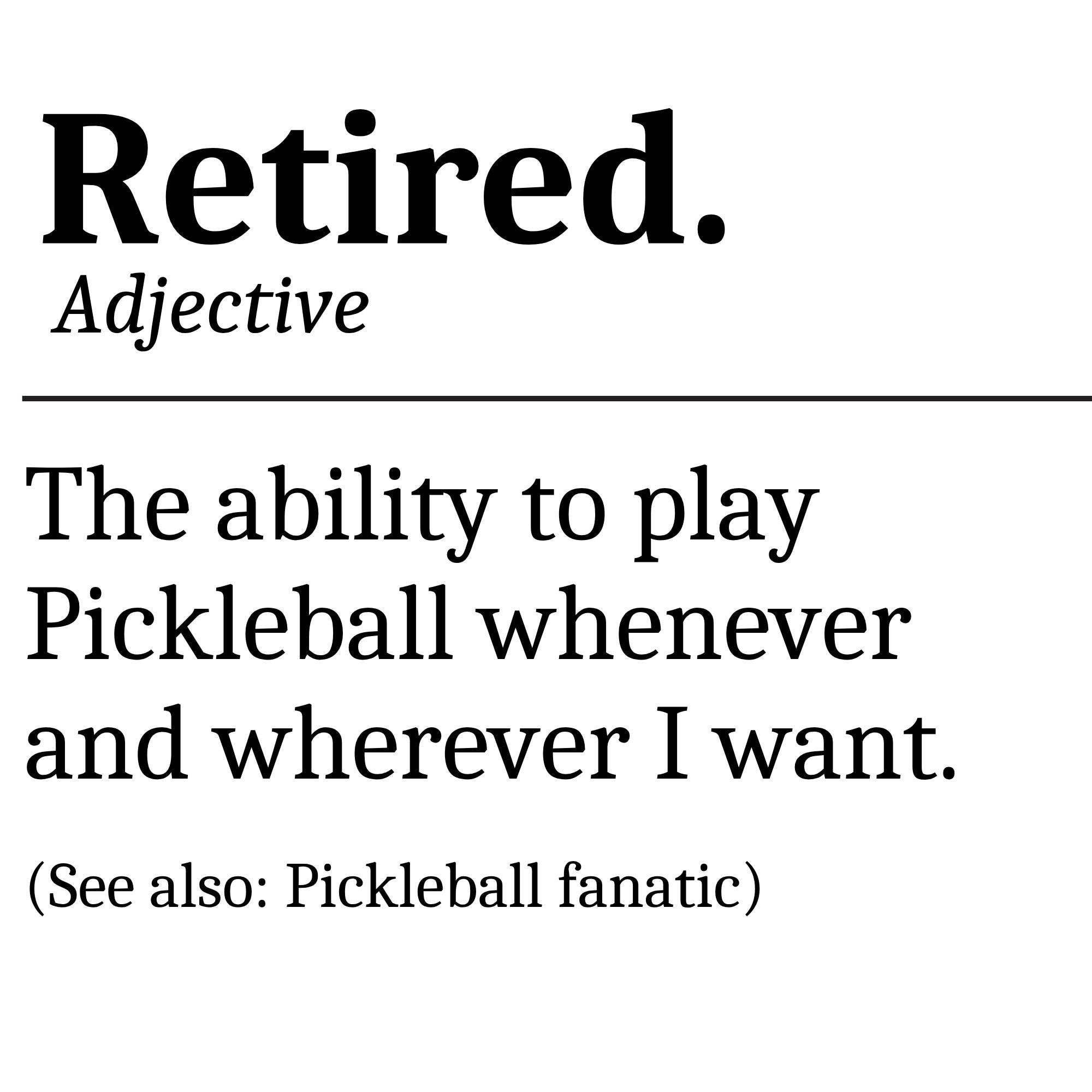 Finally living the dream? This Retired. Adjective. sticker says it all: “The ability to play Pickleball whenever and wherever I want.” Designed like a quirky dictionary definition, it’s the perfect badge of honor for retired players who live on the court.